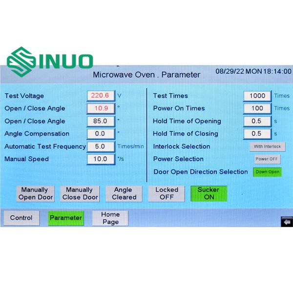 Feature: The equipment adopts PLC and servo motor control, with all stainless steel mechanical arms, vacuum suction structure, standard TFT true color LCD touch screen, can preset test angle and speed, simulated a human hand to open and close the door of microwave ovens and similar equipment, achieve intelligent control. The machine frame is made of high grade aluminum alloy profile, and the mechanical arms are installed on the columns, can satisfy left open and upper open door endurance test of different size. The power supply socket has the function of detecting, which can judge whether the test sample is electrified; during load test, if the test sample is not electrified during the test, the equipment will be automatically shut down. This feature can be enabled on the demands.